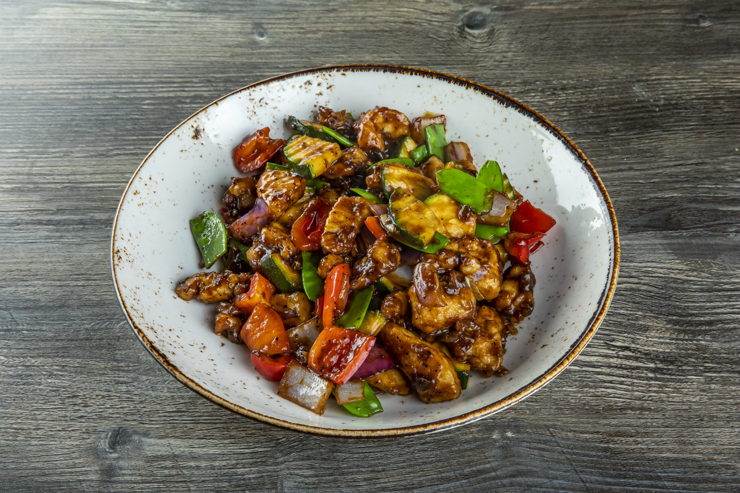 Sliced chicken, snow peas, red bell peppers, onions and zuccini in a black peppercorn sauce